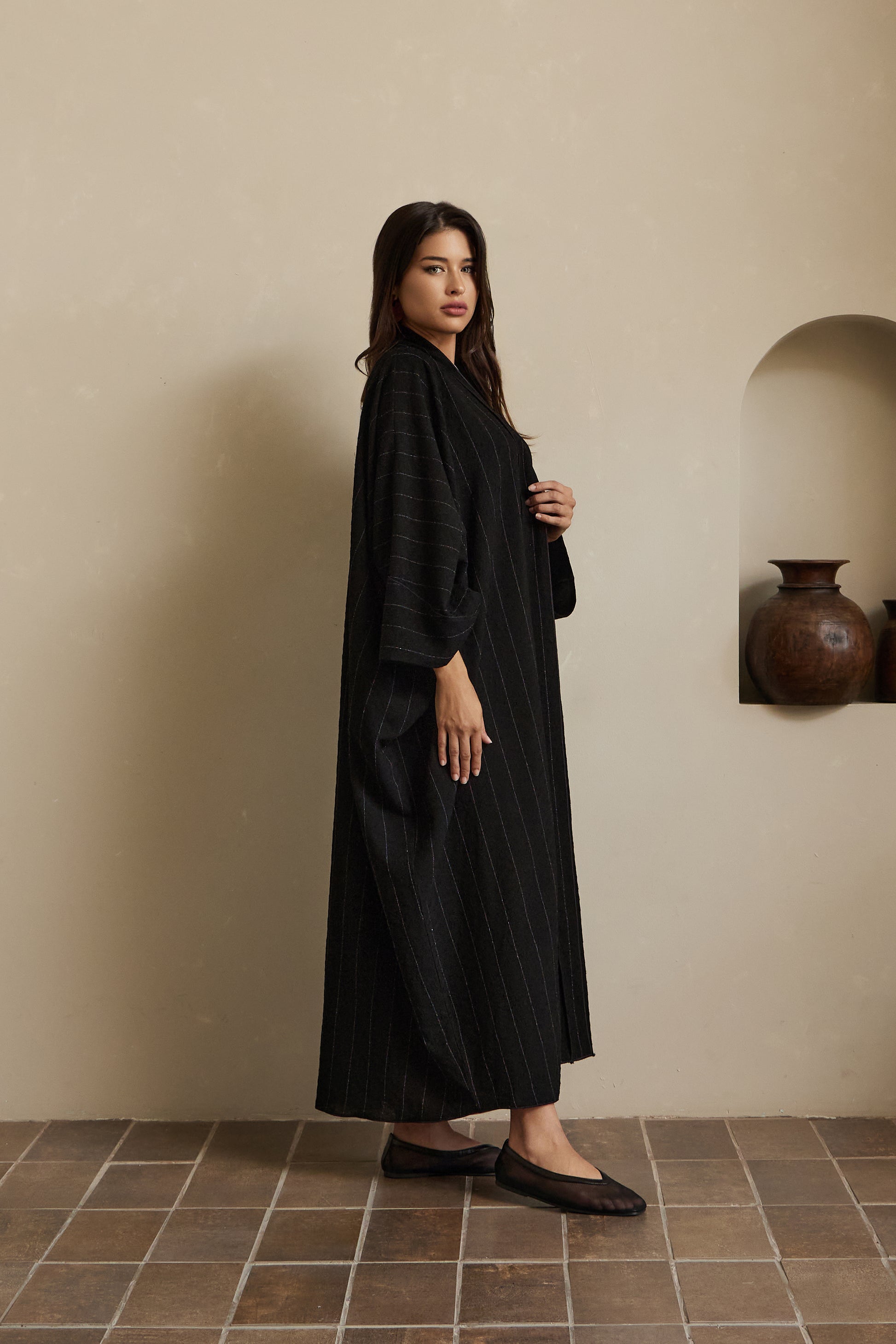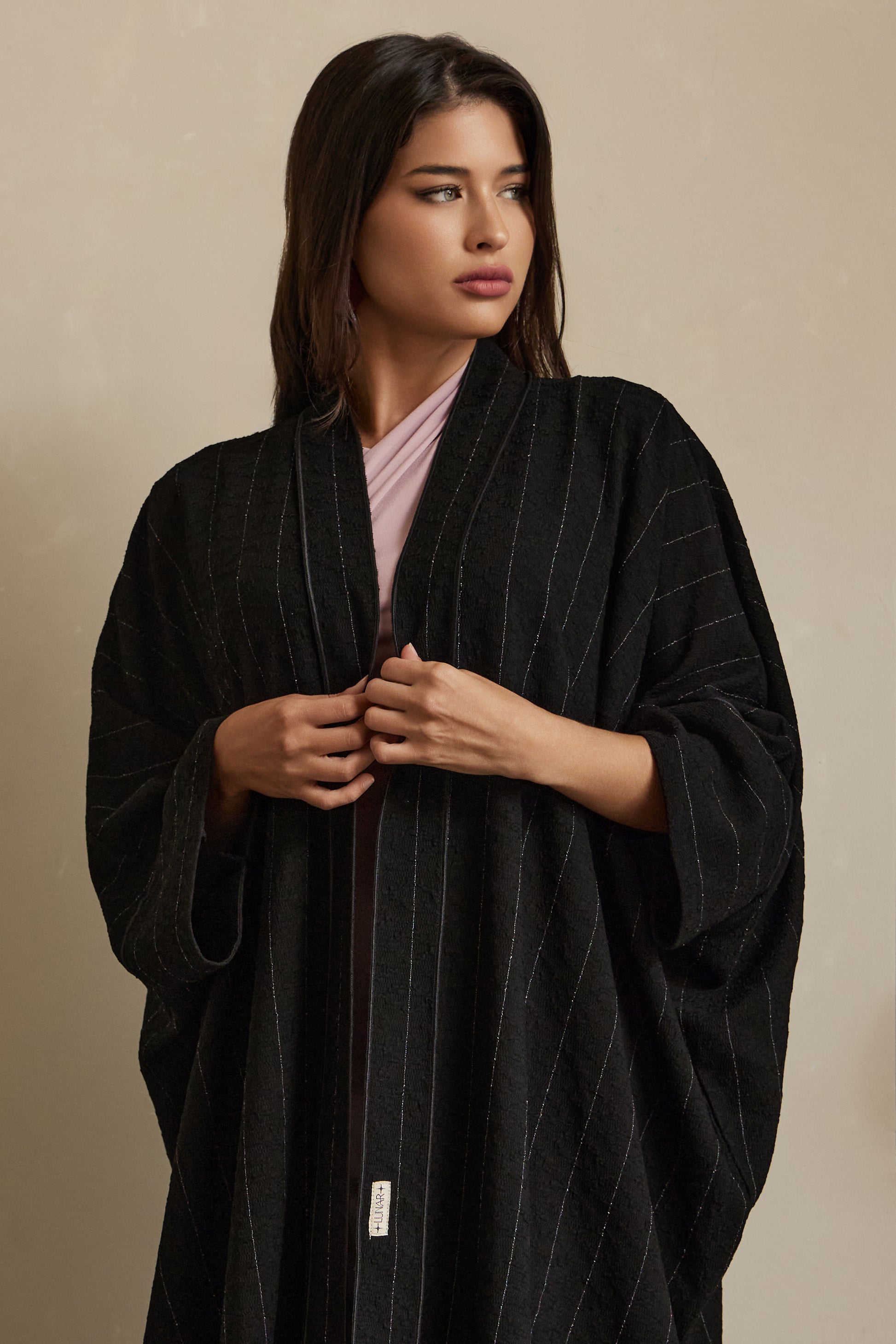 The "Noor" Abaya features a unique texture reminiscent of the moon’s surface, accented with delicate threads and subtle white lines. Simple yet captivating, its understated design exudes a quiet elegance that’s both charming and timeless.