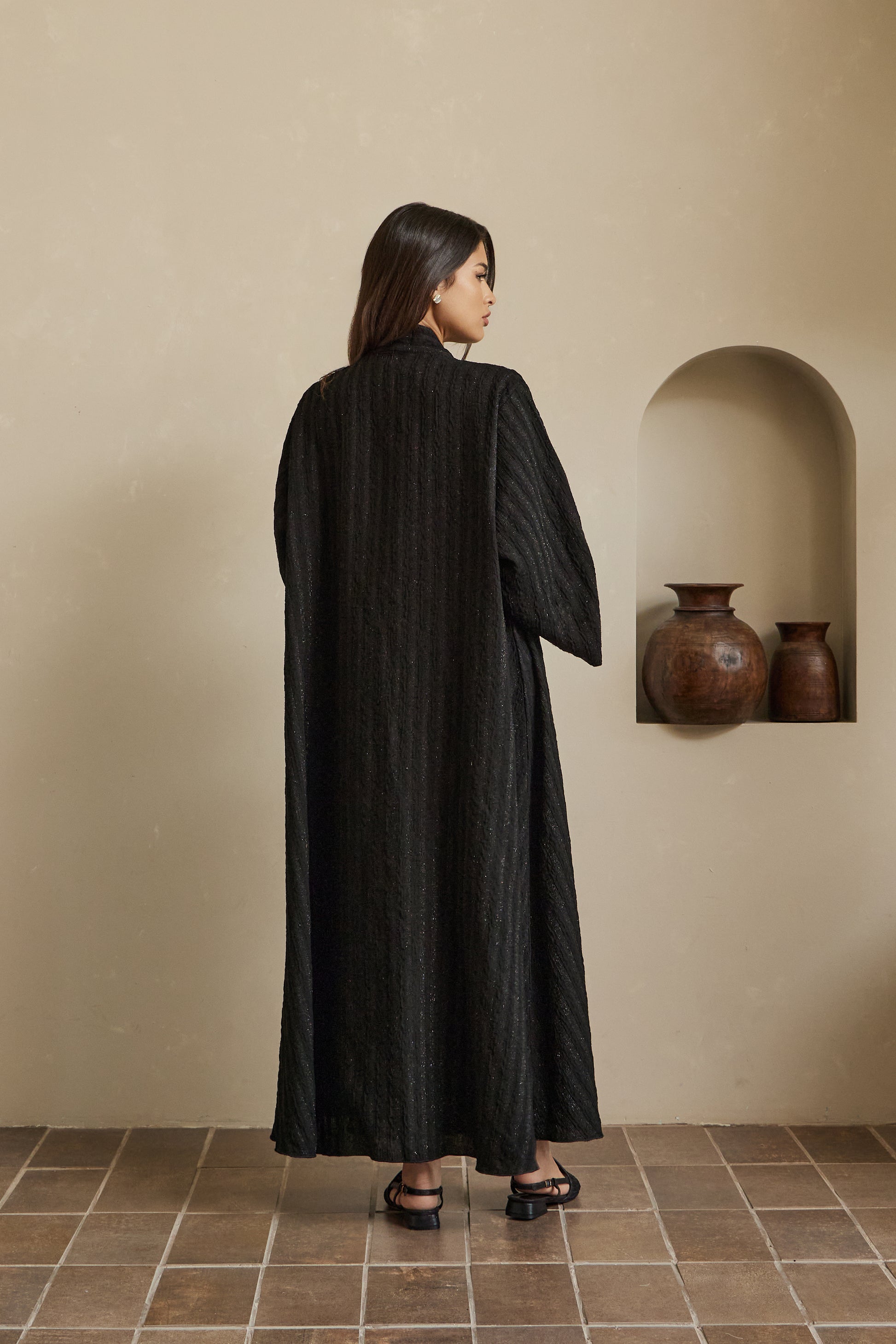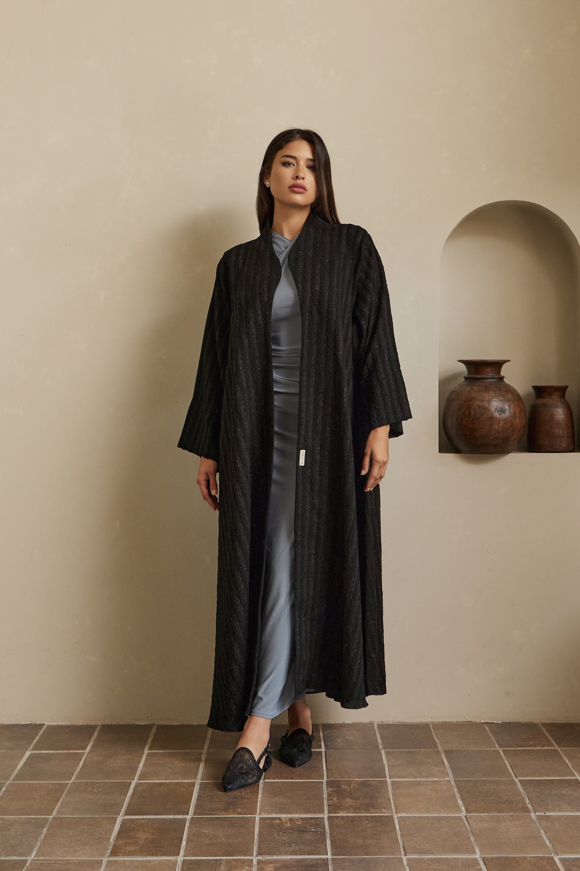 The "Horiya” Abaya features bold glitters and unique cuts that evoke a sense of endless elegance. With its striking design, it captures the essence of luxury and dynamic movement, offering a sophisticated, contemporary look that stands out effortlessly.