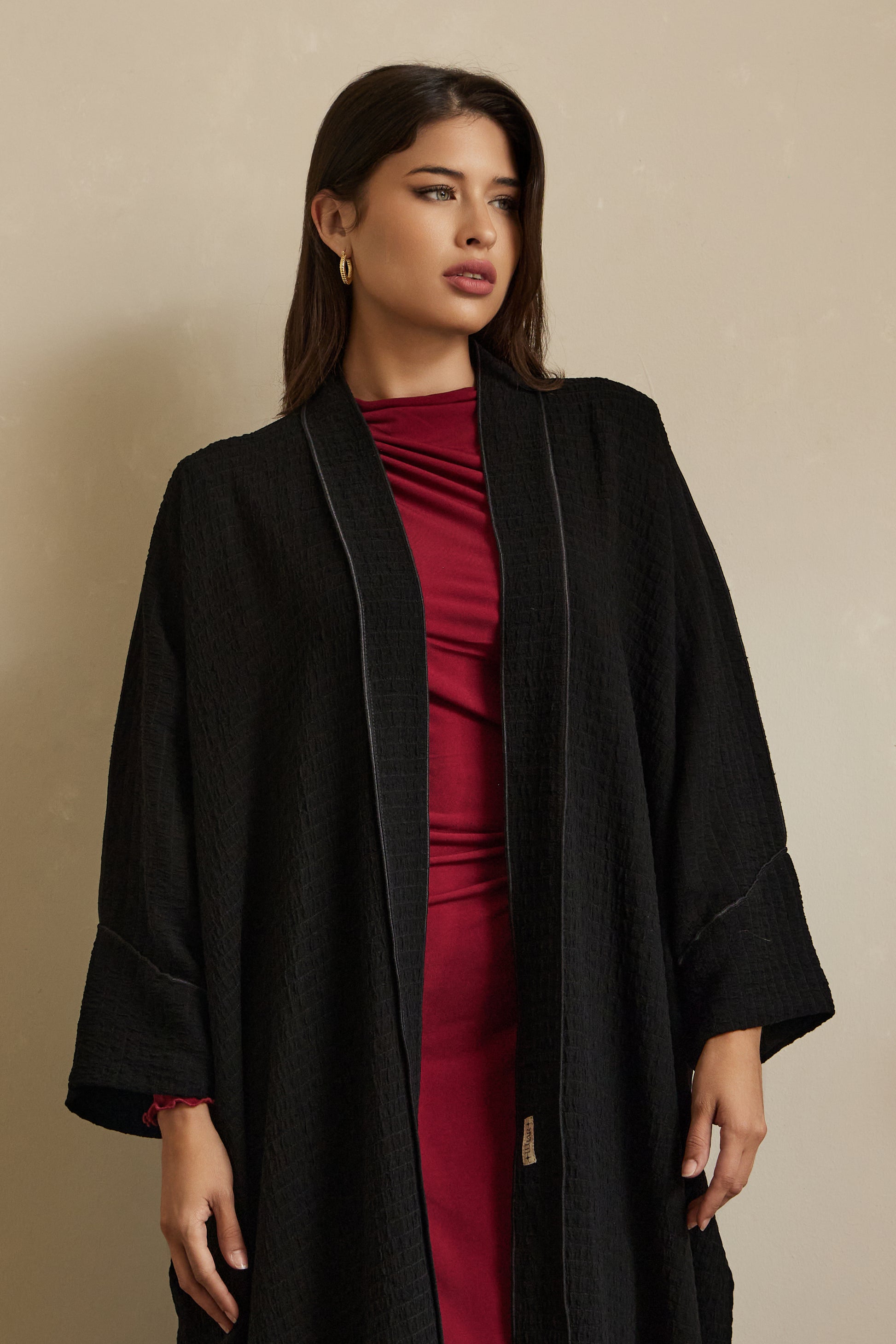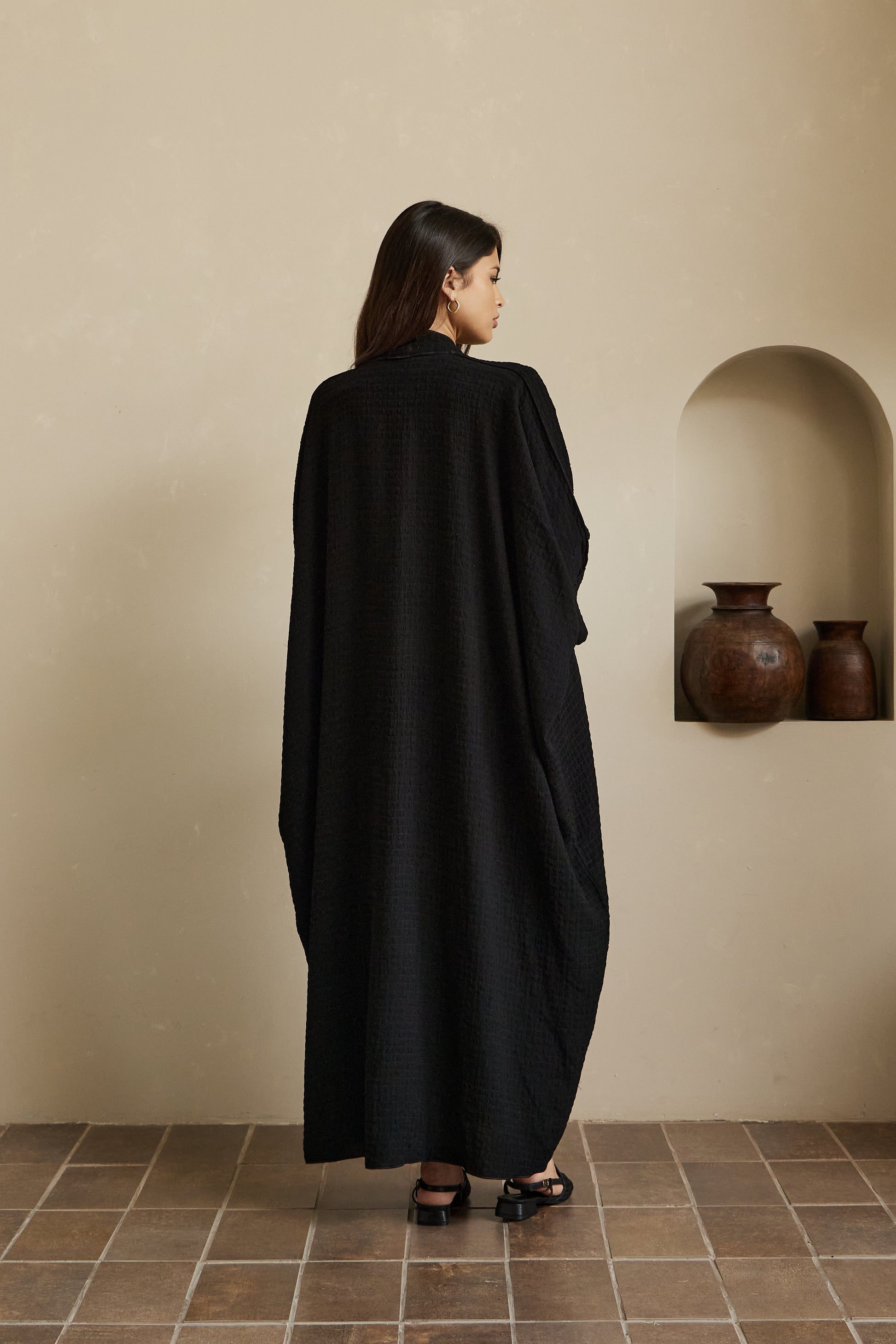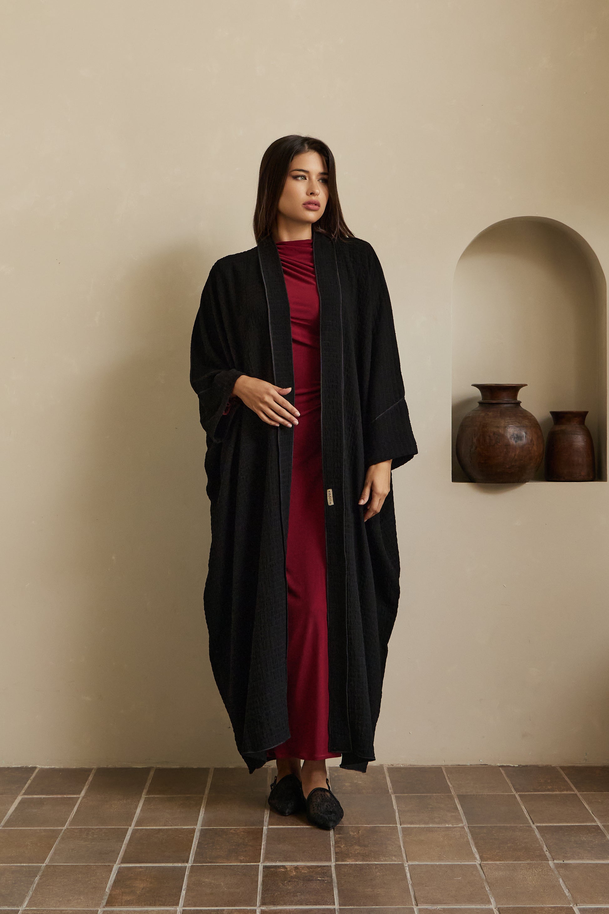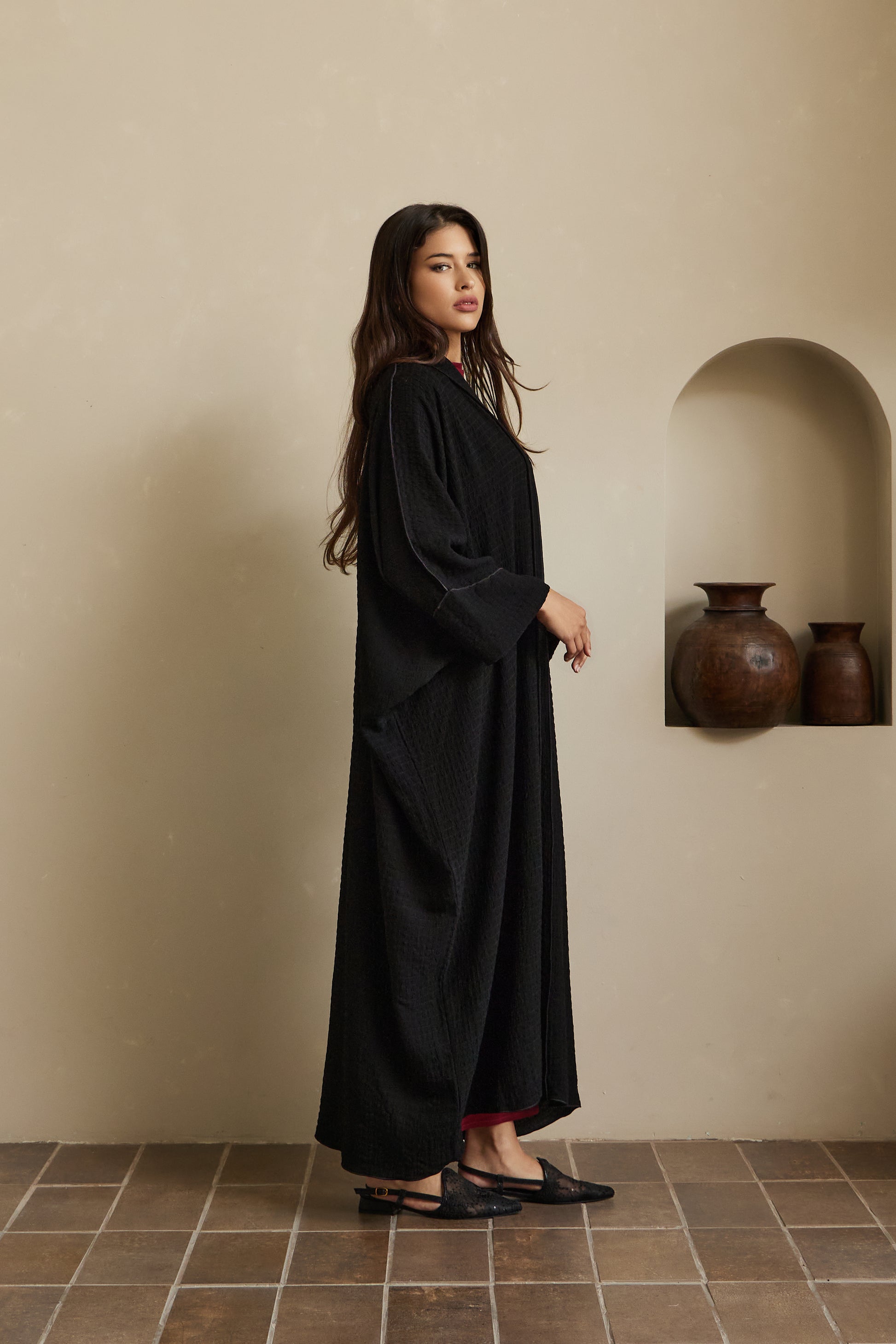 The "Shade” Abaya exudes understated elegance with its rich black hue and uniquely soft texture. Crafted to perfection, it offers a timeless, luxurious feel, embodying a sense of sophistication and quiet allure.