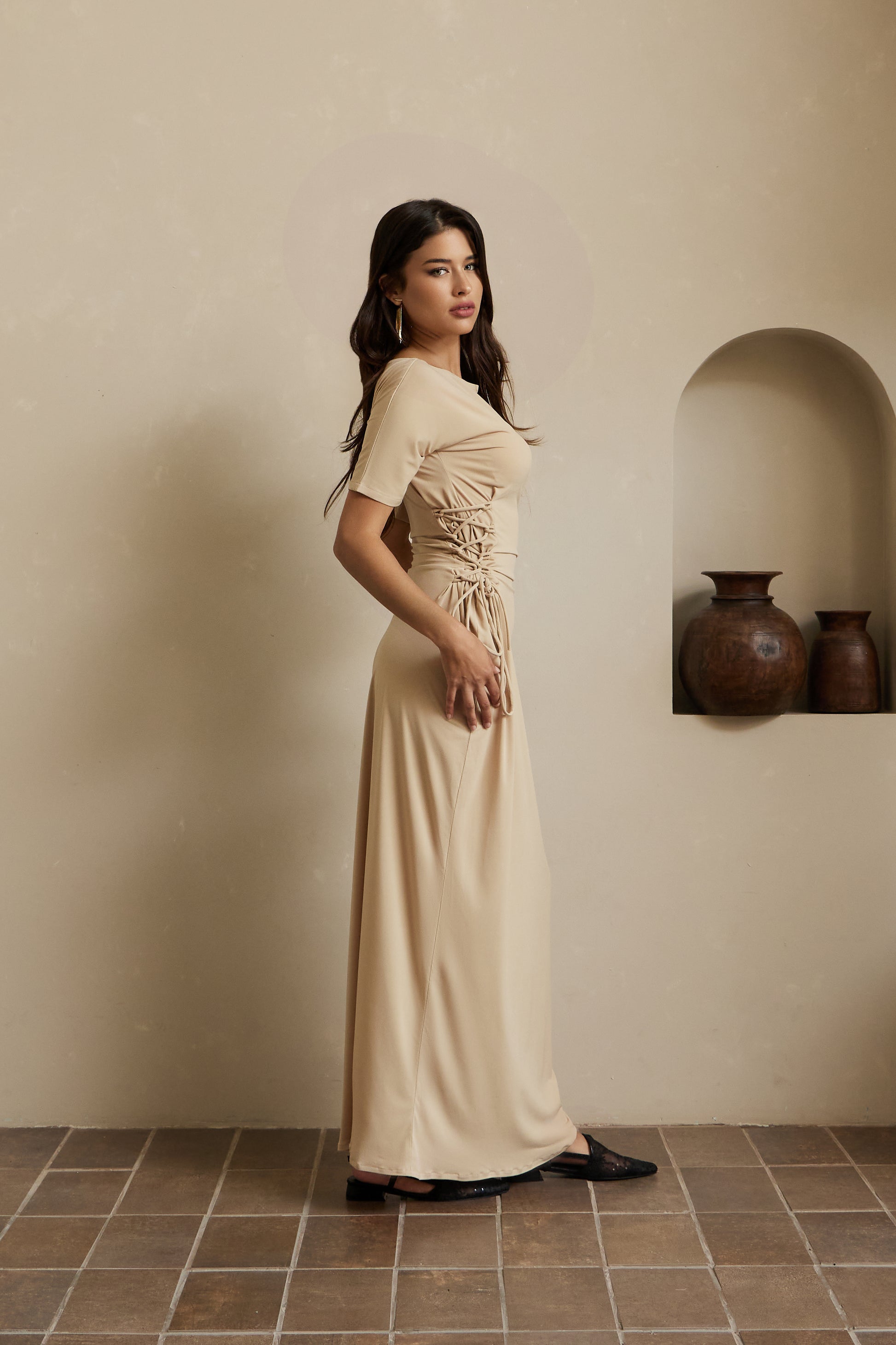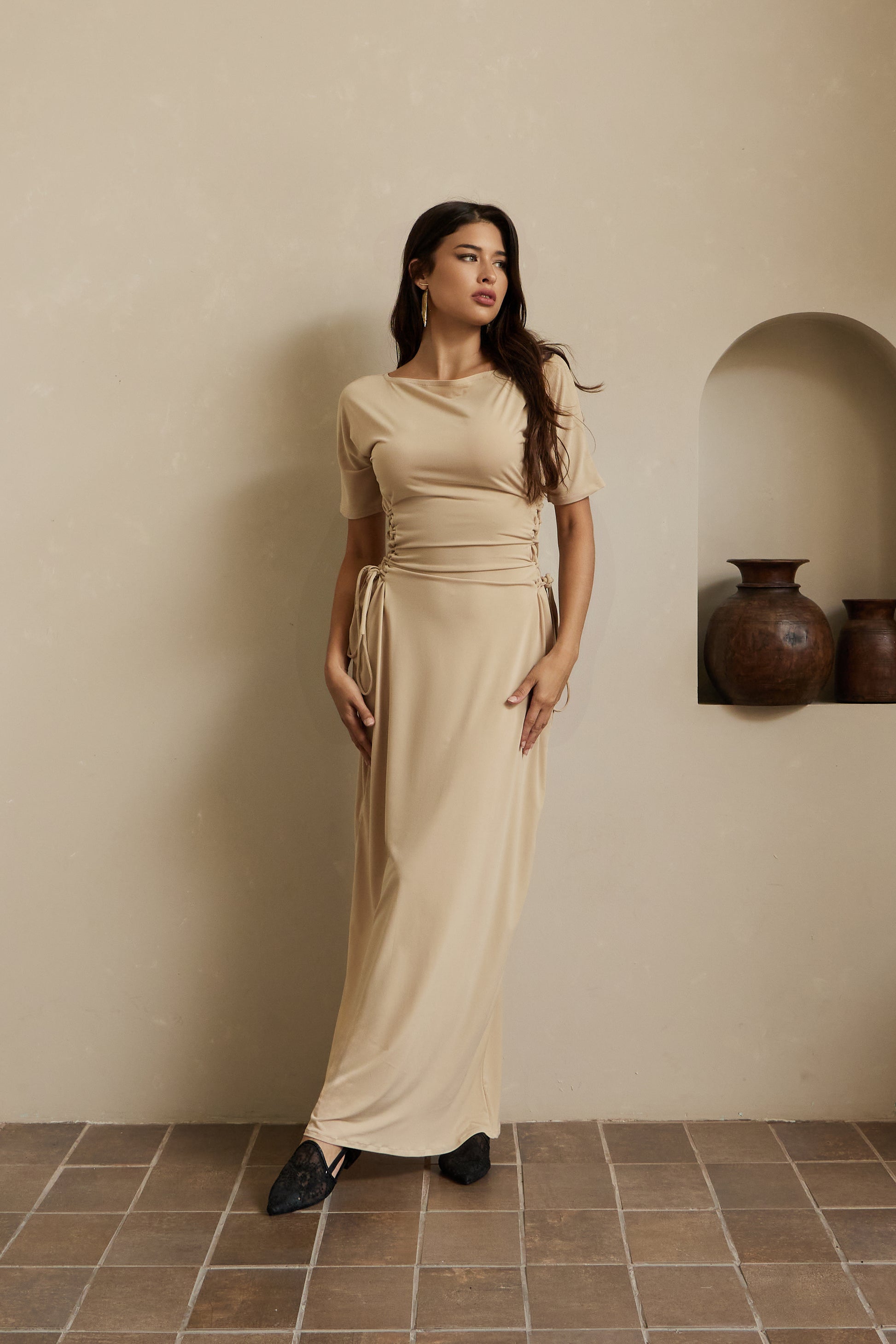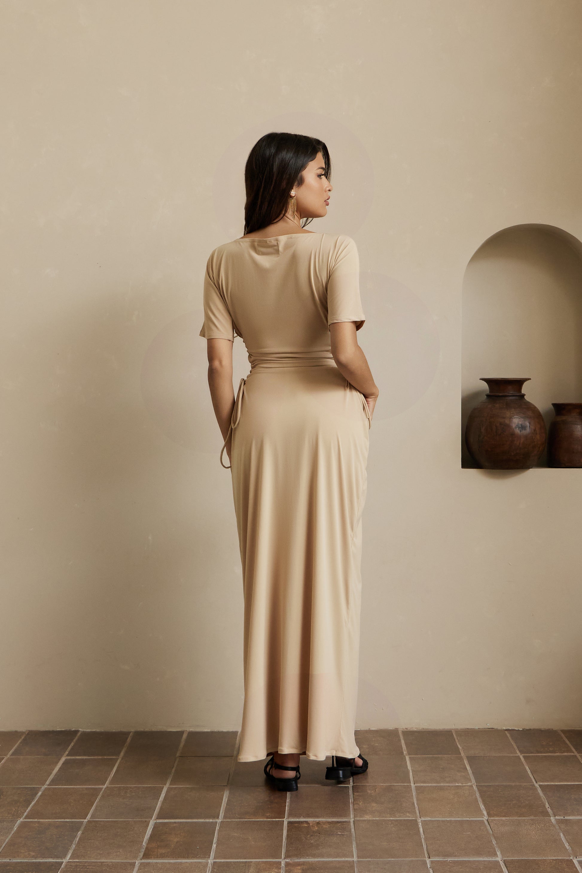 Embrace your natural beauty with this skin-toned, short-sleeved dress crafted from stretchy, sculpting fabric that contours to your body. The adjustable waist allows for a perfect fit, accentuating your shape in a sleek and flattering way. Effortlessly chic, this dress combines comfort with a custom, curve-hugging silhouette.
