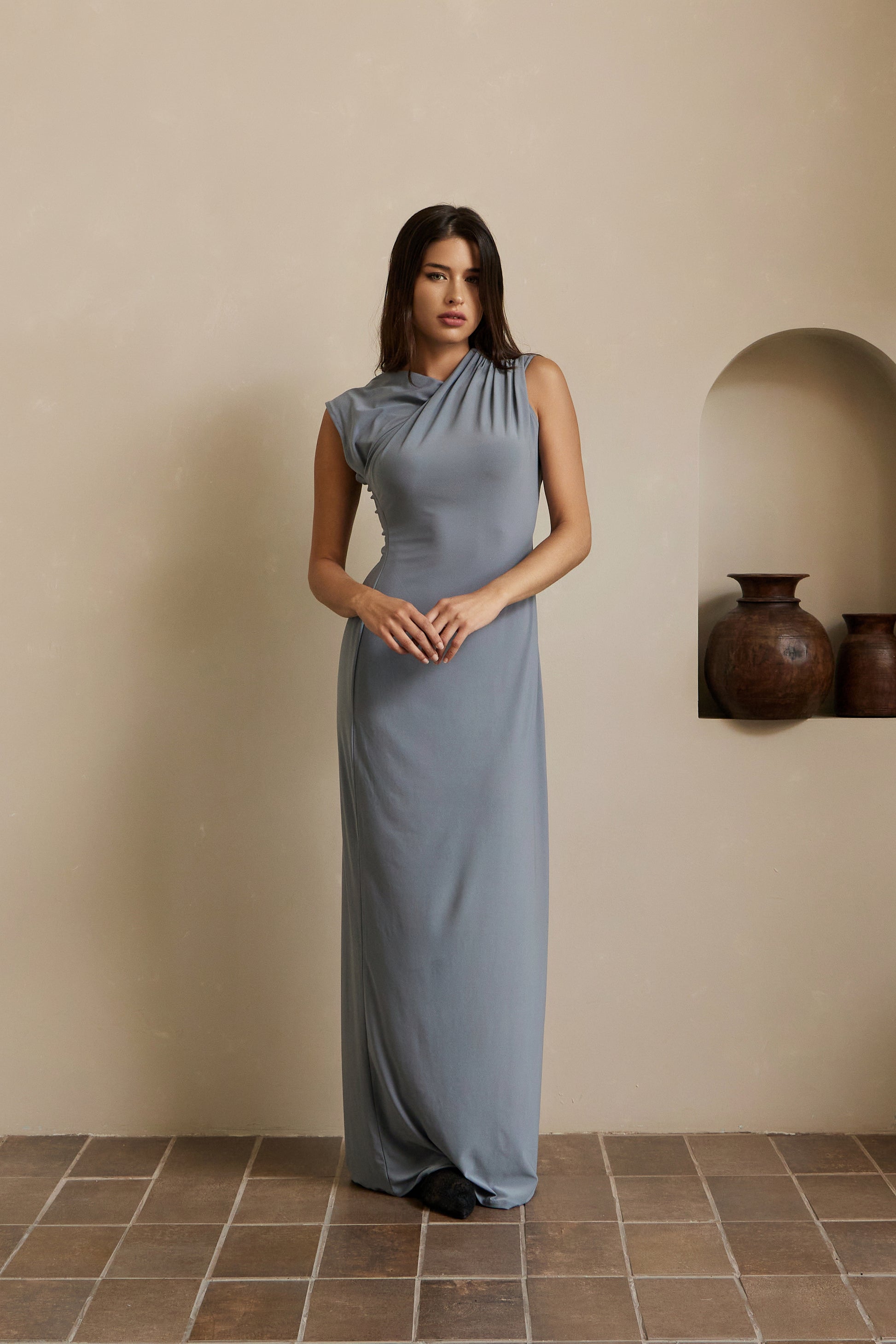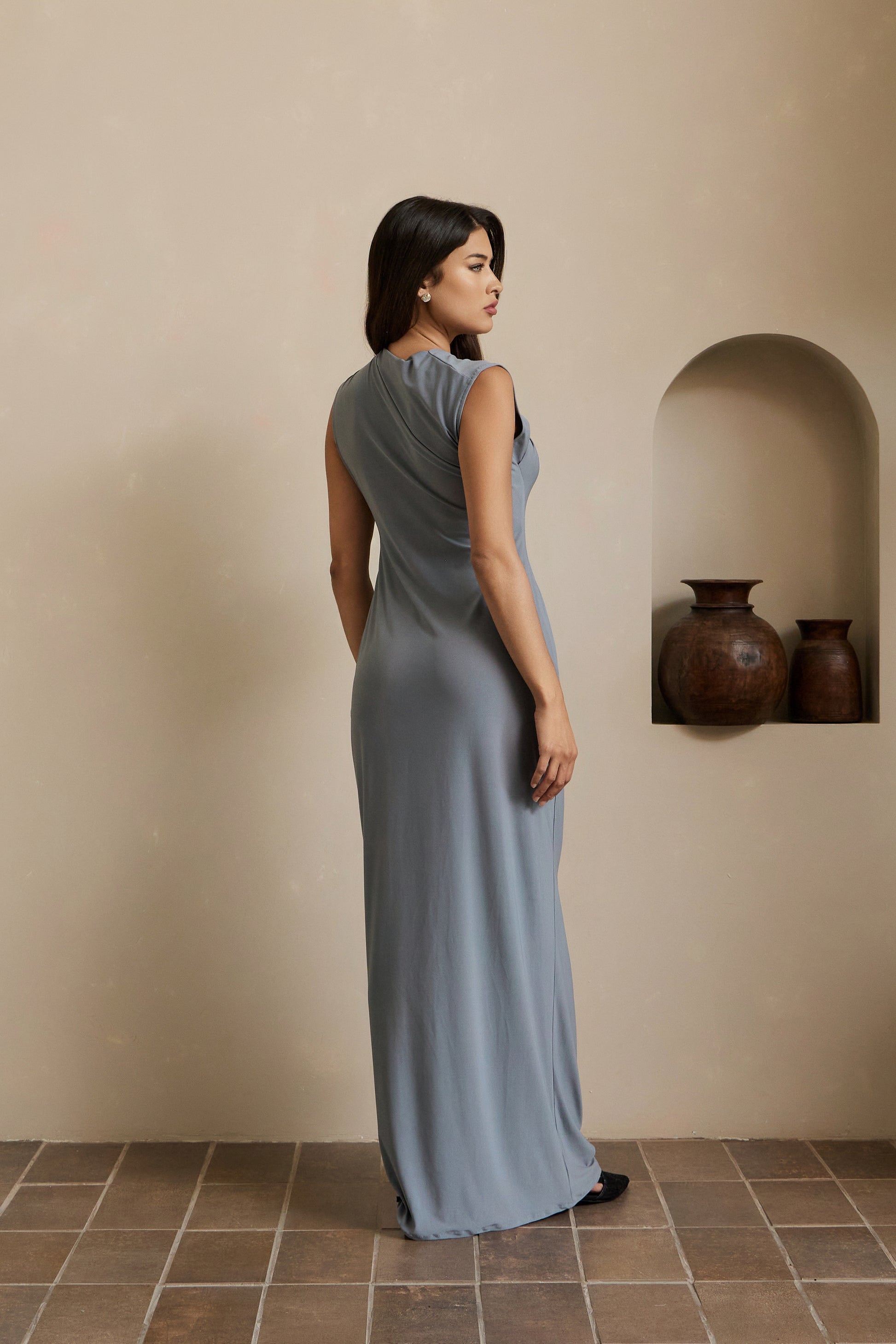 Contour your figure in this sleeveless, blue/gray dress, made from stretchy fabric that sculpts your body. A subtle neckline detail adds a refined touch, creating a feminine and effortlessly stylish piece perfect for any occasion.