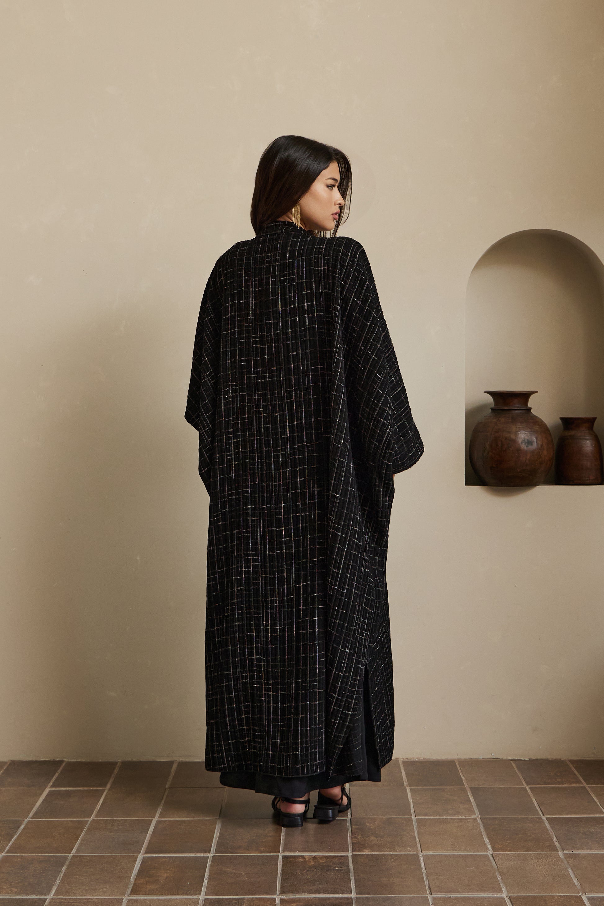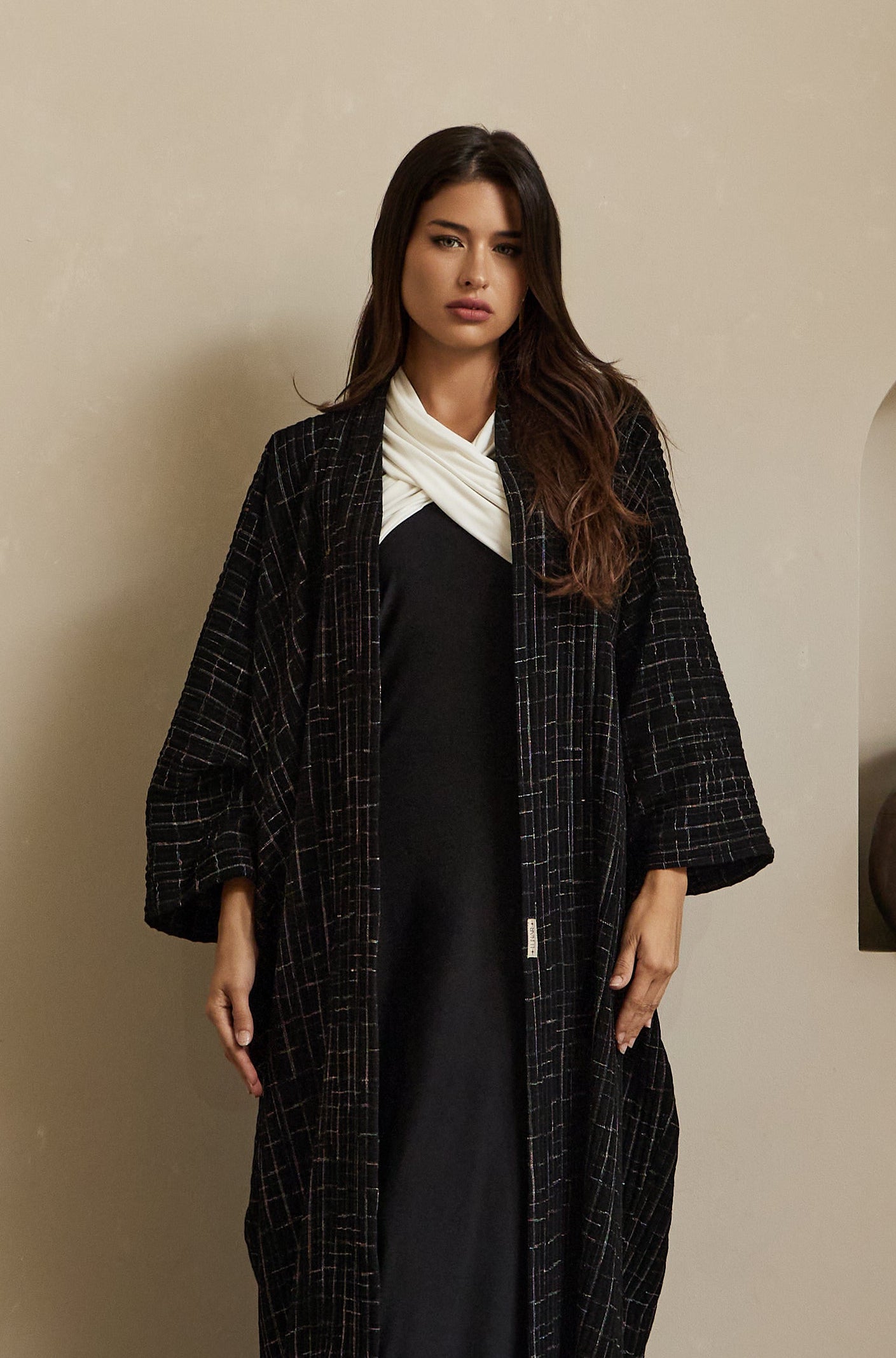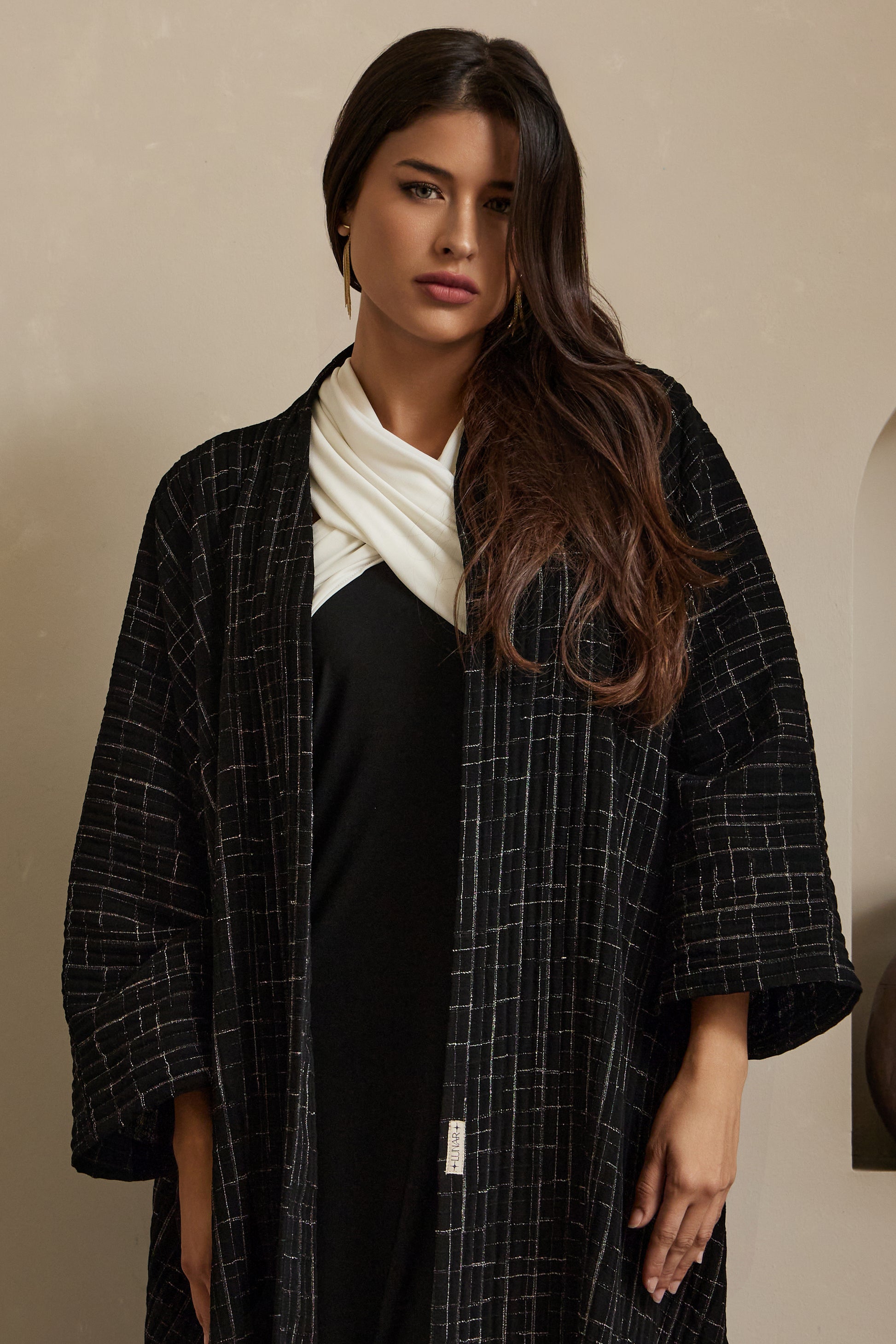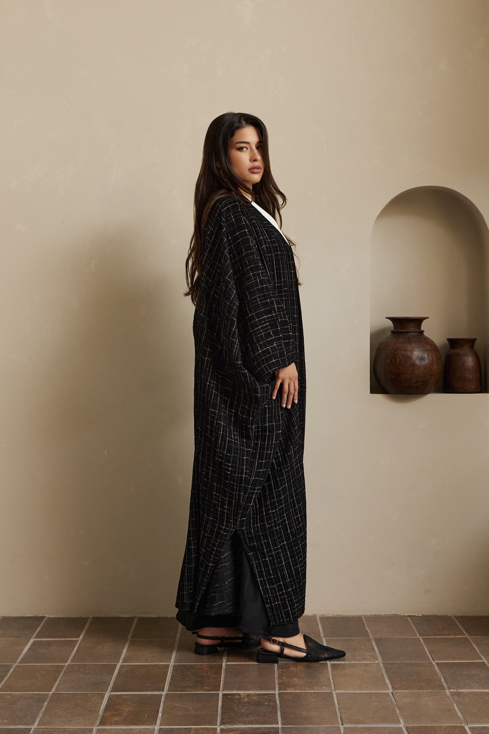 The "Serene" Abaya features bold, striking white sketches that create a powerful contrast against its sleek silhouette. With its dramatic design, it captures a sense of mystery and elegance, making a bold yet refined statement.